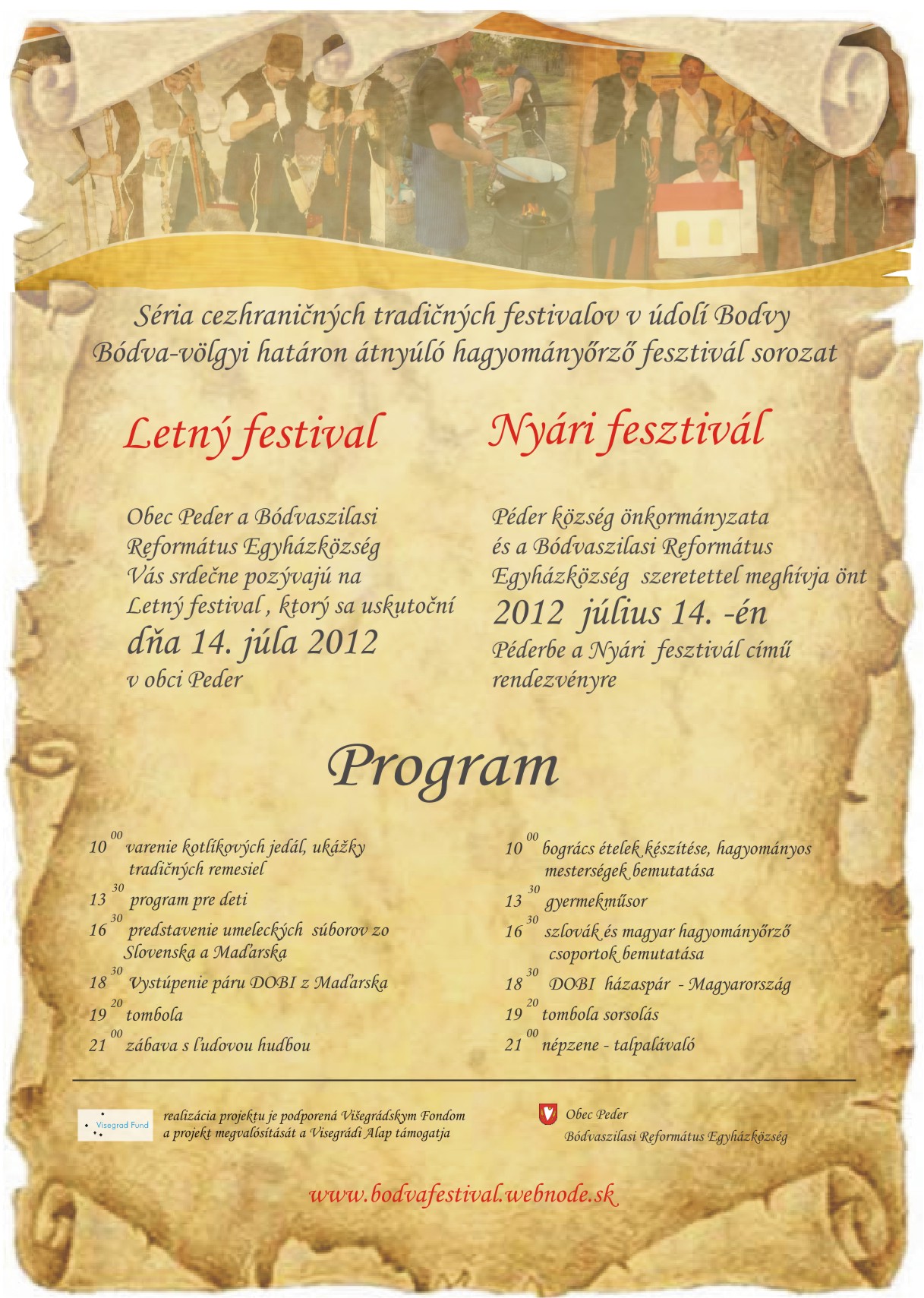 Letný festival Peder bude zameraný na prezentáciu tradičnej ľudovej kultúry – to znamená prezentáciu tradičných remesiel, varenie tradičných jedál, vystúpenia ľudových speváckych a tanečných súborov, ale aj amatérske divadlá, ktoré predvádzajú hry zo života bežného obyvateľstva.
